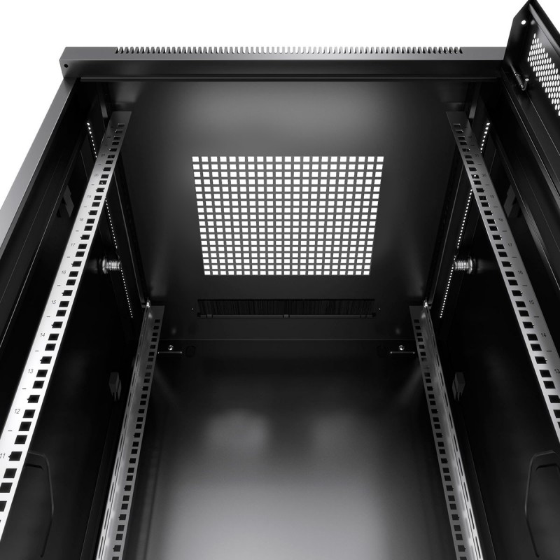 В основание шкафа и в крыше предусмотрены щеточные вводы для защиты оборудования от пыли при вводе информационного и силового кабеля. В шкафу великолепно продумана естественная (пассивная) вентиляция, за счет перфорации в корпусе шкафа и на передней дверце. А так же, конструктивно, предусмотрена установка активной вентиляции.
